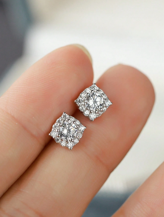 These elegant halo earrings feature brilliant moissanite center stones surrounded by a sparkling halo, set in S925 sterling silver. Timeless and versatile, they add a touch of sophistication to any outfit, perfect for daily wear or special occasions.
